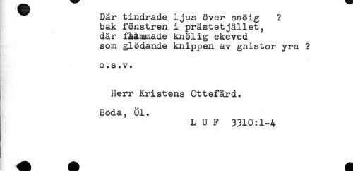 //// Där tindrade ljus över snöig ? //// bak fönstren i prästetjället, //// där fä&mmade knölig ekeved //// som glödande knippen av gnistor yra ? //// o.s.v. //// Herr Kristens Ottefärd. //// Böda, Öl. //// L U F 3310:1-4 ////