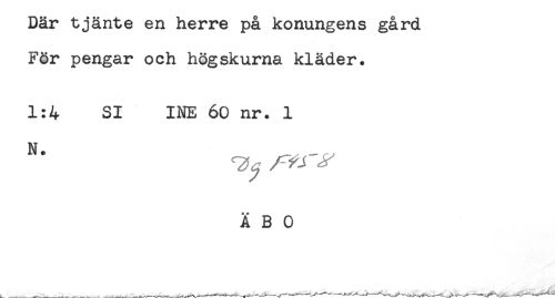 //// Där tjänte en herre pa konungens gard //// Får pengar och högskurna kläder. //// 1:4 SI INE 60 nr. 1 //// N * __ ^ //// Ä B 0 ////