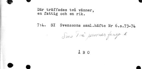 //// Där träffades två vänner, //// en fattig och en rik. //// 7:4. SI Svenssons saml.häfte Nr 6.s.73-74 //// A B 0 ////