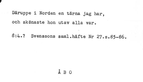 //// Däruppe i Norden en tärna jag har, //// och skönaste hon utav alla var. //// j //// 3:4.? Svenssons saml.häfte Nr 27.s.35-36. ////
