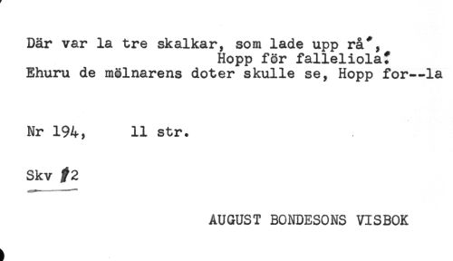 //// Där var la tre skalkar, som lade upp rå*, //// Hopp för falleliola? //// Ehuru de mölnarens doter skulle se, Hopp for-la //// Nr 194, 11 str. //// Skv //// AUGUST BONDESONS VISBOK ////