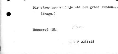 //// Där växer upp en lija uti den gröna lunden.. //// ^ (fragm.) //// Högseröd (Sk) //// L U F 2261:28 //// L .../ \....... - ....... ////