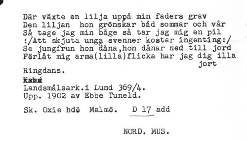 //// Där växte en lilja uppå min faders grav //// Den liljan hon grönskar båd sommar och vår i //// Så tage jag min båge så tar jag mig en pil //// :/Att skjuta unga svenner kostar ingenting: //// /Se jungfrun hon dåna,hon dånar ned till jord //// Förlåt mig arma(lilla)flicka har jag dig illa //// jort //// Ringdans. //// Kxhä //// Landsmålsark.i Lund 369/4. //// Upp. 1902 av Ebbe Tuneld. //// Sk. Oxie hdö Malmö. D 17 add //// NORD. MUS. ////