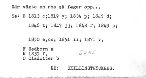 //// Där växte en ros så fager opp... //// Se: E 1813 c;l8l9 y; 1834 p; 1845 d; //// 1846 t; 1847 jj; 1848 f; 1849 p; //// 1850 e,cc; 1851 ii; 1871 v, //// F Hedborn a //// N 1839 f, ^ //// 0 Olsdotter b //// KB: SKILLINGTRYCKREG. //// ^ * - ** * , -t //// . ' - ' "- ^ * 1 ////