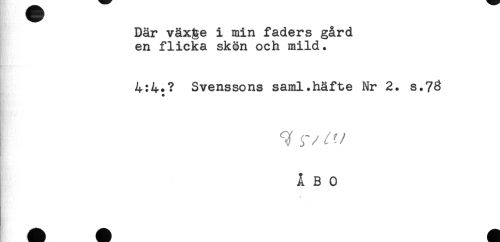 //// Där växge i min faders gård //// en flicka skön och mild. //// 4:4.? Svenssons saml.häfte Nr 2. s.?8 //// + //// ÅBO ////