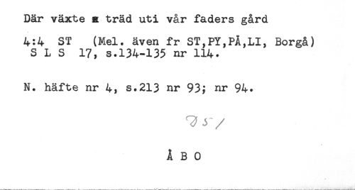 //// Där växte a träd uti vår faders gård //// A //// 4:4 ST (Mel. även fr ST,PY,PÅ,LI, Borgå) //// SLS 17, s.134-135 nr 114. //// N. häfte nr 4, s.213 nr 93; nr 94. //// ^ 3 //// /ÅBO ////