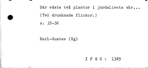 //// Där växte två plantor i jordelivets vår... //// ^ (Två drunknade flickor.) //// S. 35-36 //// t //// Karl-Gustav (Vg) //// - //// < //// I F G H : 1385 //// 4 - ////