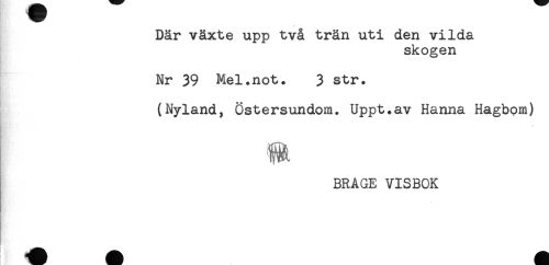 //// Där växte upp två trän uti den vilda //// skogen //// Nr 39 Mel.not. 3 str. //// (Nyland, Östersundom. Uppt.av Hanna Hagbom) //// * //// BRAGE VISBOK ////