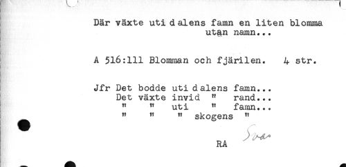 //// ' Där växte uti dalens famn en liten blomma //// i ut§n namn ... //// I A 516:111 Blomman och fjärilen. 4 str. //// Jfr Det bodde uti dalens famn... //// ' Det växte invid " rand... //// I " " uti " famn... //// i " " " skogens " //// RA ////