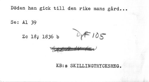 //// Döden han gick till den rike mans gård... //// Se: Al 39 //// Zc 13; 1336 b y^/^g* //// KB:s SKILLINGTRYCKSREG. ////