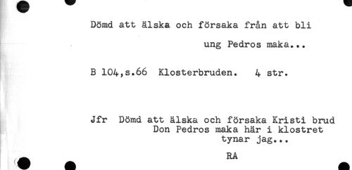 //// Dömd att älska och försaka från att bli //// - //// ung Pedros maka.+. //// B 104,s+66 Klosterbruden. 4 str. //// Jfr Dömd att älska och försaka Kristi brud //// Don Pedros maka här i klostret //// tynar jag... //// ^ RA ////