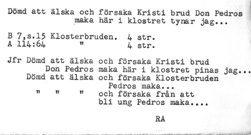 //// Dömd att älska och försaka Kristi brud Don Pedros //// maka här i klostret tynar jag... //// i //// B 7,s.l5 Klosterbruden. 4 str. //// A 114:64 " 4 str. //// Jfr Dömd att älska och försaka Kristi brud //// Don Pedros maka här i klostret pinas jag... //// Dömd att älska och försaka Klosterbruden //// Pedros maka... //// " " " och försaka från att //// bli ung Pedros maka.... //// RA ////