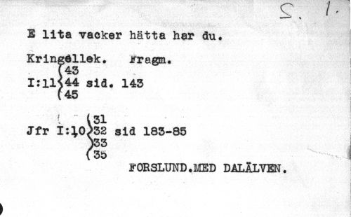 //// E lita vacker hätta har du. //// ** //// Kringéllek. Fragm. //// (43 //// I:il<44 sid. 143 //// (45 //// t (31 //// Jfr i:^o)32 sid 183-85 //// j //// FORSLUND.MED DALÄLVEN. //// < s //// . ////