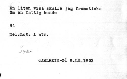 //// Sn liten visa skulle jag f rams ticka //// 6m en fattig bonde //// * . .<4 //// 't- . d //// 84 //// mel.not. 1 str. //// CARLHEIM-G^ S.LM.1892 ////