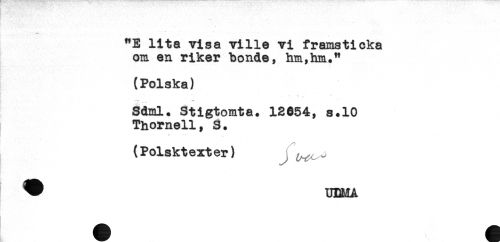 //// "E lita visa ville vi framsticka //// om en riker bonde, hm,hm." //// (Polska) //// ^ - < ^ , //// f ' ; < //// Sdml. Stigtomta. 12054, s.10 //// Thornell, 3. //// (Polsktexter) ^^^ //// - //// ^ UDMA //// - ////
