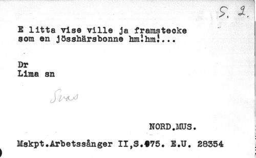 //// > J //// E litta vise ville ja framstecke //// son en jösshärsbonne hmlhmL.. //// Dr //// Lima sn //// NORD.MUS. //// Mskpt.Arbetssånger II,S.#75. E.U. 28354 ////