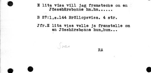 //// V E lita visa vill jag framstecke om en //// J ös s ehårsbonne hm.hm...... //// ** //// B 27:l,s.l44 Bröllopsvisa. 4 str. //// ! //// Jfr.E lita visa velie ja framstelle om //// en Jösshärsbonne hum,imm... //// RA //// * ////