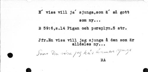 //// E" visa vill ja" sjunga,som a' så gott //// * //// som ny... //// i - . . . - - - //// B 59:6,s+14 Pigan och paraplyn.5 str. //// Jfr.En visa vill jag sjunga å den som är //// alldeles ny... //// RA //// g ////