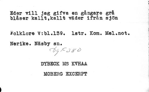 //// ! //// * //// Eder vill jag gifva en gångare grå //// blåser kallt,kallt väder ifrån sjön //// Folklore V:bl.l39. latr. Kom. Mel.not. //// f //// t //// t //// Nerike. Näsby sn. //// DYBECK MS KVHAA //// MOBERG EXCERPT ////