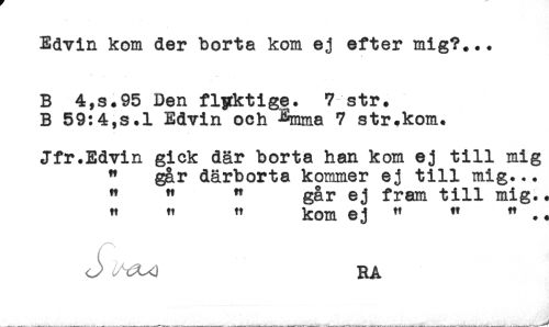//// Edvin kom der borta kom ej efter mig?... //// B 4,s.95 Den flyktige. 7 str. //// B 59:4,s.l Edvin och ^mma 7 str.kom. //// Jfr.Edvin gick där borta han kom ej till mig //// " går därborta kommer ej till mig... //// " " " går ej fram till mig.. //// " " " kom ej " ^ " .. //// J^ RA ////