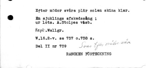 //// } ....... //// Efter mödor svåra plår solen skina klar. //// ^E) En sjuklings afskédss&ng ; //// ur lots. A.Stolpes v&sb. //// Rep b. Wall gr. //// j //// W.16.2-V. se 737 0.738 s. ^ //// DU II nr 739 J, . ^ ^ ^^ //// RANCKEN FÖRTECKNING ////