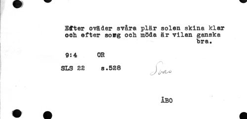 //// Efter oväder svåra plär solen skina klar //// och efter soBg och möda är vilan ganska //// bra. //// 9:4 OR //// SLS 22 s.538 ////
