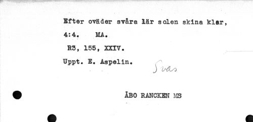 //// - - //// Efter oväder svåra lär solen skina klar, //// 4:4. MA. //// R5, 155, XXIV. //// Uppt. E. Aspelin. //// J M^t //// # ÅBO RANCKEN MS ////