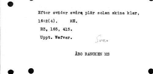 //// E - - - - - . . //// Efter oväder svårq plär solen skina klar, //// . //// 16:2(4). RE. //// - * //// ' * t //// . //// R3, 165, 415. //// * - V //// Uppt. Wefvar. //// J //// ÅBO RANCKEN MS ////