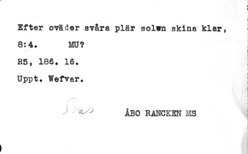 //// ! //// Efter oväder svåra plär solwn skina klar, //// 8:4. MU? //// R5, 186. 16. //// Uppt. Wefvar. //// ! //// ] //// ^ ^ ÅBO RANCKEN MS ////