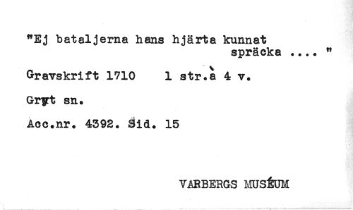 //// "Ej bataljerna hans hjärta kunnat //// spräcka .... * //// Gravskrift 1710 1 str.a 4 v. //// Gryt sn. //// Acc.nr. 4392. Sid. 15 //// VARBERGS HUSÉUM ////