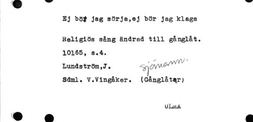 //// Ej bö# jag sörja,ej bör jag klaga //// Religiös sång ändrad till gånglåt. //// 10165, s.4. //// Lunds tr öm, J. ^ ^ ^ //// Sdml. V.Vingåker. (Gånglåtar; //// ULiviA ////