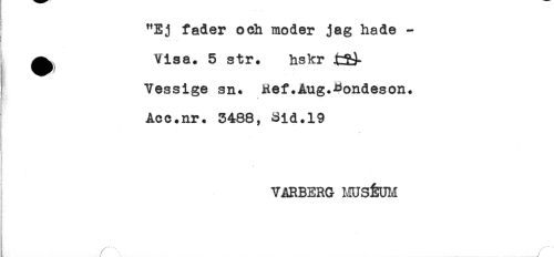 //// : "Ej fader och moder jag hade - //// 5 ... //// Visa. 5 str. hskr //// Yessige sn. Ref.Ang+Rondeson. //// w * //// t //// i! - //// Åcc.nr. 3488, Sid.19 //// t //// VARBERG MUSÉUH ////