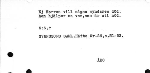 //// [ ! - ' * //// Ej Herren vill någon syndares död, //// han hjälper en var,som är uti nöd. //// j: //// - //// 6:6.? //// i * //// SVENSSONS S<AML.Häfte Nr.29,s.51-52. //// K //// ÅBO ////