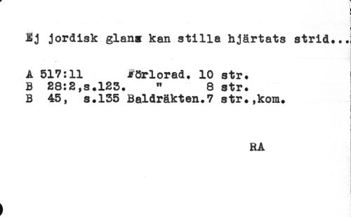 //// L //// t //// - . . j //// Ej jordisk glana kan stilla hjärtats strid... //// ** . * //// A 517:11 Förlorad. 10 str. //// B 28:2,s.123. " 8 str. //// B 45, s.135 Baldräkten.7 str.,kom. //// t //// RA ////