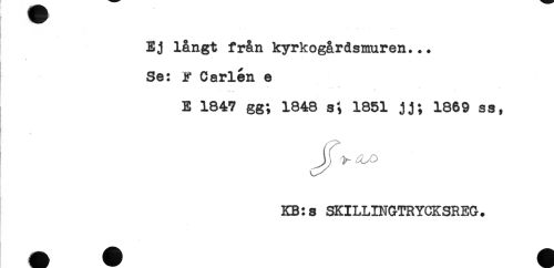 //// Ej långt från kyrkogårdsmuren... //// Se: F Carlén e //// tu f //// E 1847 gg; 1848 s; 1851 jj; 1869 ss, //// KB:s SKILLINGTRYCKSREG. ////