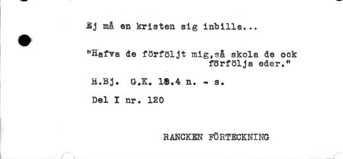//// t //// Ej må en kristen sig inbilla... //// - //// t //// "Hafva de förföljt mig,så skola de ock //// förfölja eder." //// H.Bj. G.K. 18.4 n. - s. //// Del I nr. 120 //// RANCKEN FÖRTECKNING ////