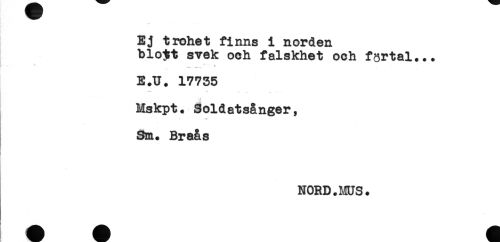 //// Ej trohet finns i norden //// blo^t svek och falskhet och förtal... //// t - + //// E.U. 17755 //// - * ^ ^ - - //// j //// Mskpt. Soldatsånger, //// Sm. Braås //// i //// NORD.MUS. ////