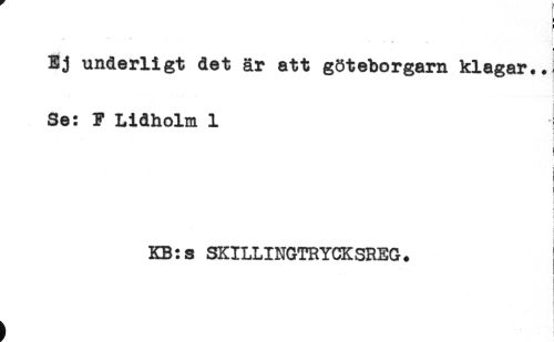 //// f //// . - . ^. ^ //// ! //// ! //// Ej underligt det är att göteborgarn klagar.. //// Se: F Lidholm 1 //// r //// t //// r //// } //// < //// KB:s SKILLINGTRYCKSREG. ////