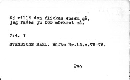 //// ) //// - . //// Ej villd den flickan ensam gå, //// jag rädes ju f8r mörkret så. //// i //// ! //// 7:4. ? //// ! //// . //// * //// SVENSSONS SAML. Häfte Nr.12.s.75-76. //// ; //// ! //// ! //// t //// ÅBO //// ! //// h * ////