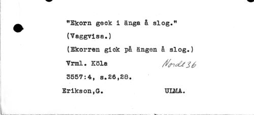 //// ^ "Ekorn geok i änga å slog.^ //// (Vaggvisa.) //// (Ekorren gick på ängen å slog.) //// Vrml. Köla //// 5557:4, s+26,28. //// Erikson,G. ULMA. ////