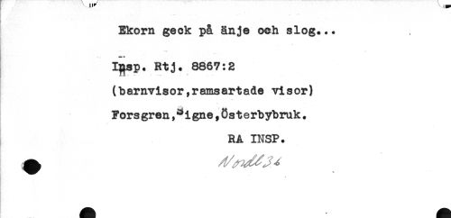 //// Ekorn geck på än je och slog... //// K'. //// B - //// Ipsp. Rtj. 8867:2 //// ! //// (barnvisor,ramsartade visor) //// Forsgren,^igne,österbybruk. //// , //// RA INSP. //// A ////