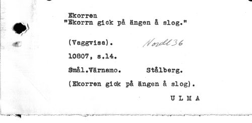 //// f. (Vaggvisa). //// 10807, s.14. //// y, //// < //// s //// Snål .Värnamo. Stålberg. //// (Ekorren gick på ängen å slog). ////