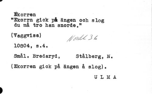 //// ... < //// Ekorren //// "Ekorm gick p& ängen och slog //// du må tro han snörde." //// j //// ] //// (Vaggvisa) //// 10804, s.4. //// Smål. Bredaryd, Stålberg, M. //// (Ekorren gick på ängen å slog). ////