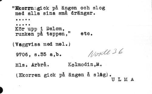 //// ! //// { //// "Ekormigick på ängen och slog //// med alla sina små drängar. //// + + + * + //// Kör upp i Dalom, //// runken på tappen," etc. //// (Vaggvisa med mel.) //// 9706, s.35 a,b. ^ ^ ^ //// Hls. Arbrå. Kolmodin,R. //// (Ekorren gick på ängen å slAg). ////