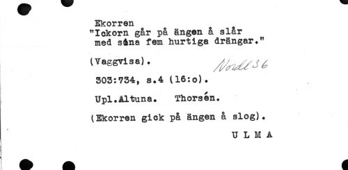 //// Ekorren //// "Iekorn går på ängen å slår //// med s&na fem hurtiga drängar." //// (Vaggvisa). //// 503:734, s.4 (16:o). //// Upl.Altuna. Thorsén. //// t Ekorren gick på ängen å slog). //// U L M A ////