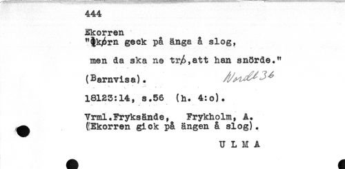 //// Ekorren //// "$!qårn geck på änga å slog, //// men da ska ne tr/>,att han snörde." //// (Barnvisa). //// - , ' - * * ^ - //// 18123:14, s.56 (h. 4:o). //// Yrml.Fryksände, Frykholm, A. //// ^ ((Ekorren gick på ängen å slog). ////