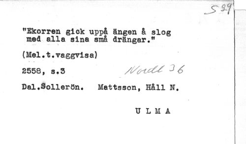 //// "Ekorren gick uppå ängen å slog //// ned alla sina små drängar." //// (Mel.t.vaggvisa) //// *. * //// 2558, s.5 //// Dal.Sollerön. Mattsson, Håll N. //// U L M A ////