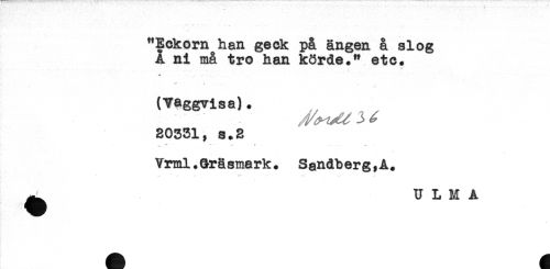 //// "Eckorn^han geck på ängen å slog //// A ni må tro han körde." etc. //// * //// i* * * < .- . //// (Vaggvisa). //// 20331, s.2 //// * ' ^ ^ - ' - ... - ......^ //// Vrml.Gräsmark. Sandberg,A. //// ^ U L M A ////