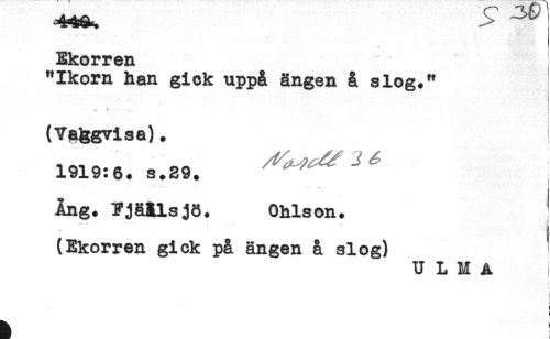 //// Ekorren //// "Ikorn han gick uppå ängen å slog." //// * -. //// (Va&gvisa). //// 1919:6.s.29. ^^^ //// Ing. FjäMsjö. Ohlson. //// (Ekorren gick på ängen å slog) ' //// U L M A //// i //// ! //// ä ! ////