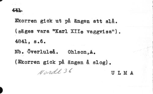 //// Ekorren gick ut på ängen att slå. //// (såges vara "Karl Xlle vaggvisa"). //// * //// c //// 4841, s.6. //// r 1 //// Nb. Overluleå. Ohlson,A. ! //// ! //// (Ekorren gick på ängen å slog). //// ^^ U L M A //// ) //// ! //// i ////